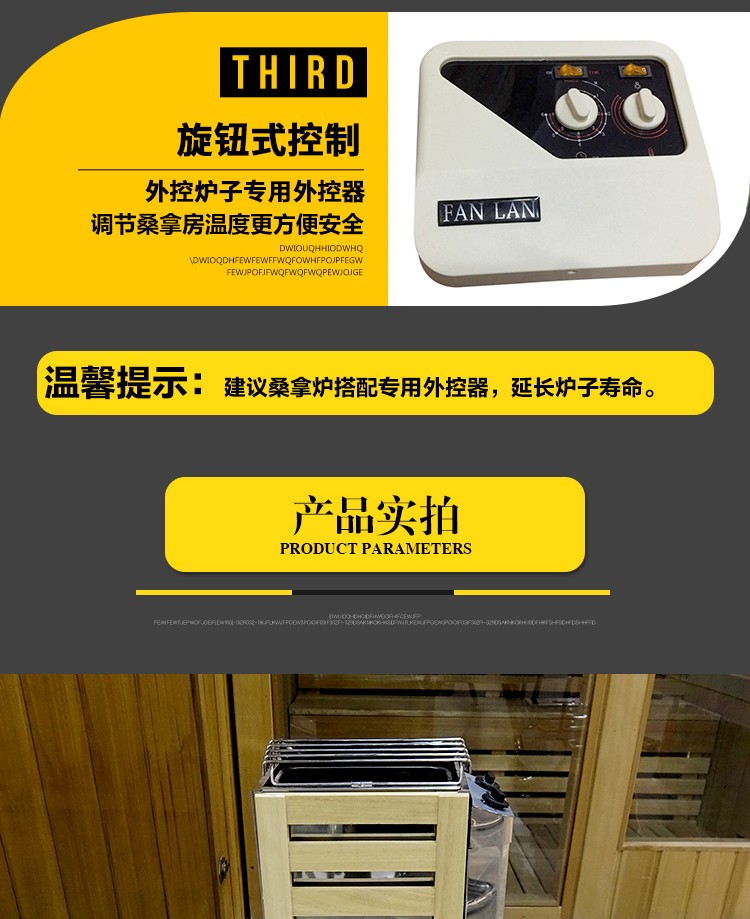 产品详情:桑拿炉,其实就是一种利用石头加热,来让室内温度上升的设备,有干蒸和湿蒸两大种类,在桑拿炉的室内待上一会就有大汗淋漓、酣畅不已的感受,有祛湿等保健作用。