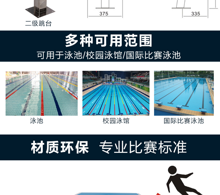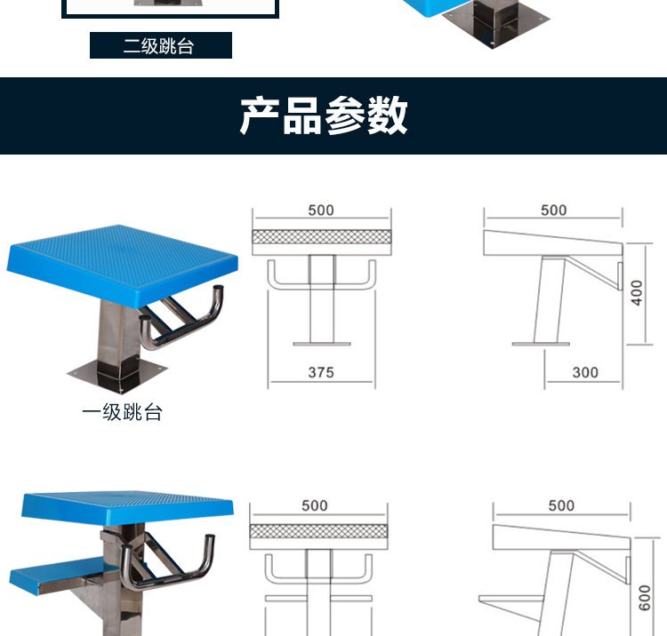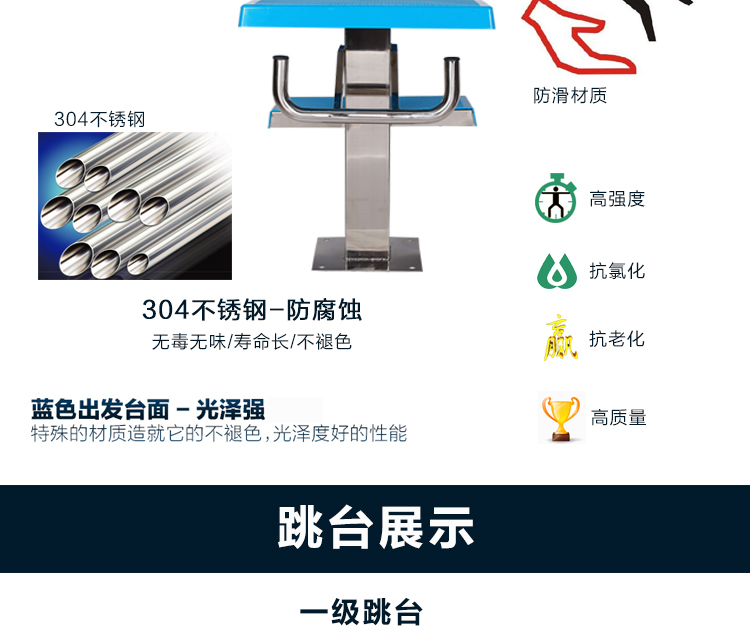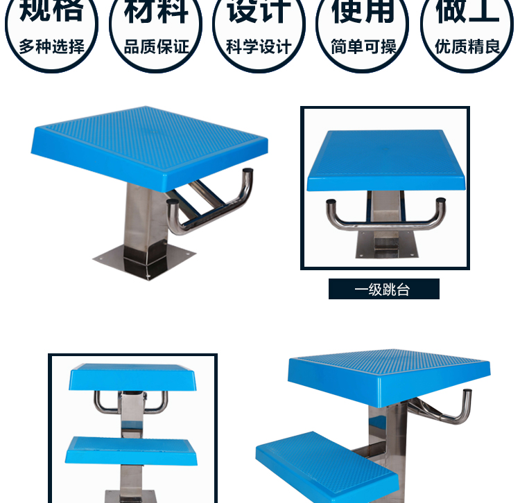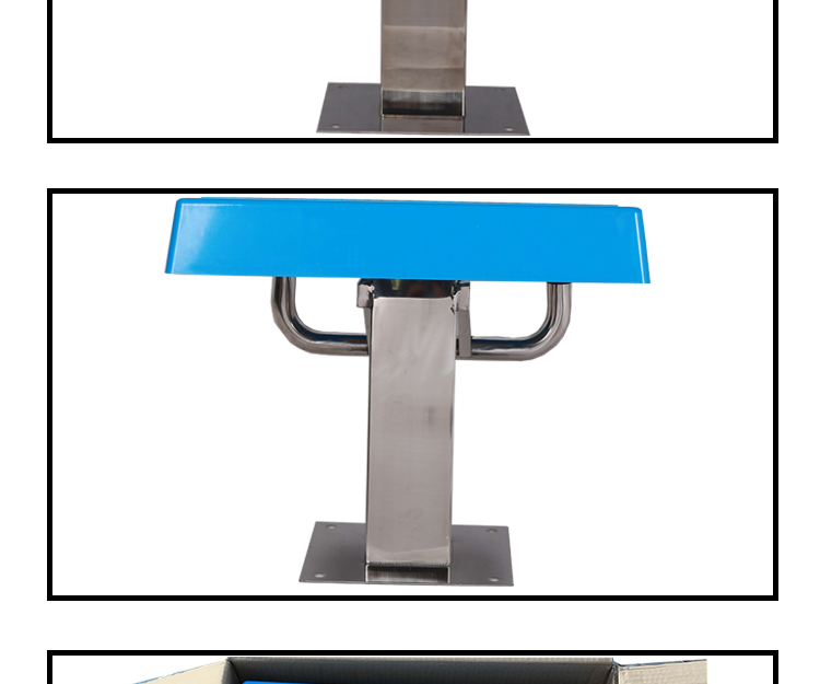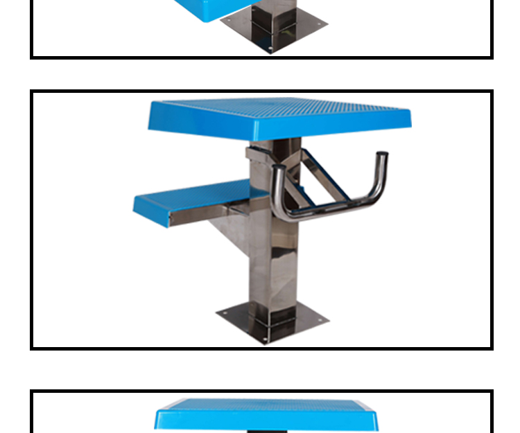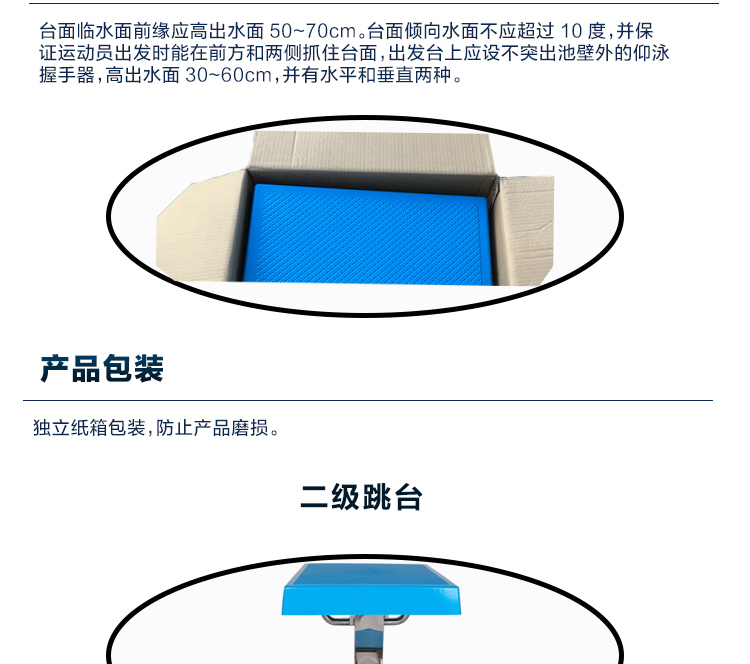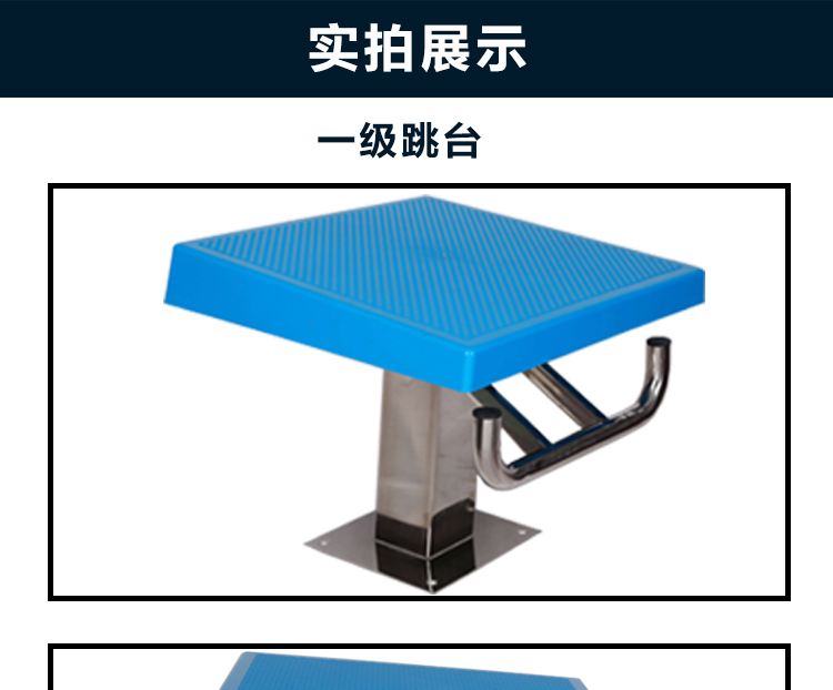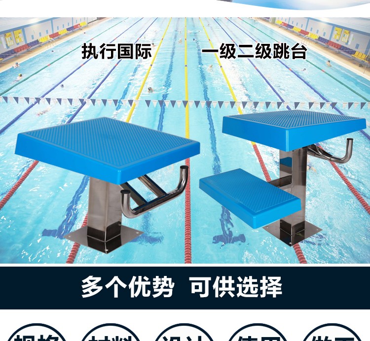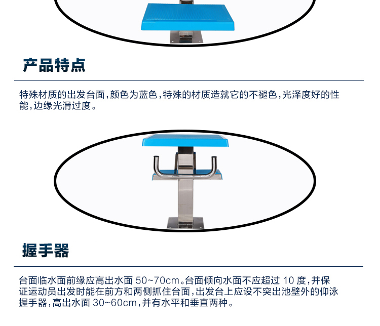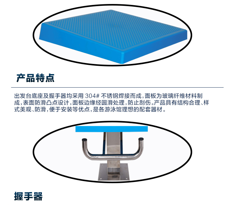 产品详情:产品特点:出发台底座及握手器均采用304#不锈钢焊接而成,面板为玻璃纤维材料制成,表面防滑凸点设计,面板边缘经圆滑处理,防止刮伤。产品具有结构合理、样式美观、防滑,便于安装等优点,是各游泳馆理想的配套器材。